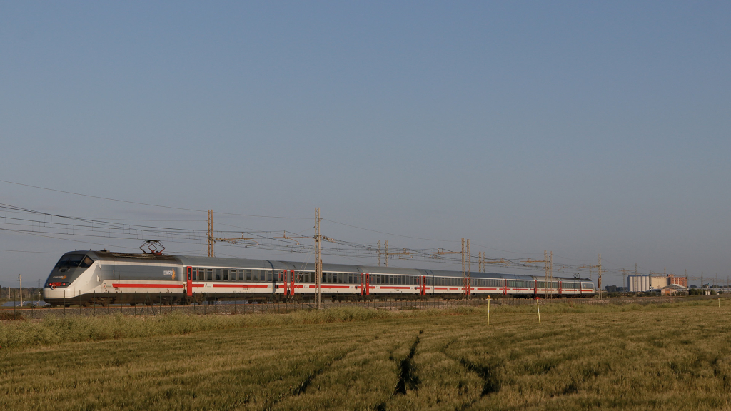Descrizione: Intercity da Lecce a Milano Centrale, in transito a Carapelle con le E414 146 e 150 alla trazione.