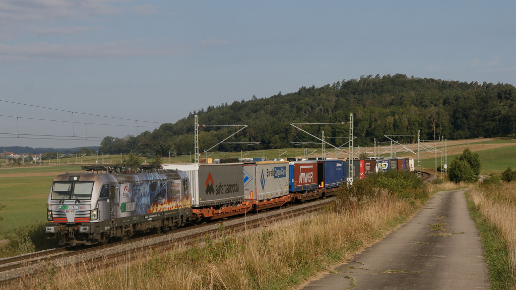 Descrizione: Convoglio merci diretto in Italia affidato alla bellissima Vectro 193 282, in transito poco dopo Oberdachstetten.