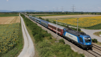 Descrizione: La 193 999 di RTB Cargo in transito nei pressi di Gotzendorf an der Leitha con un merci di Wolksvagen diretto verso est.